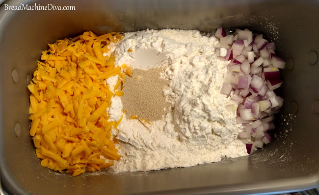 See below for metric measurements, as well as nutrition information, for this cheese and onion bread recipe for the bread machine.
